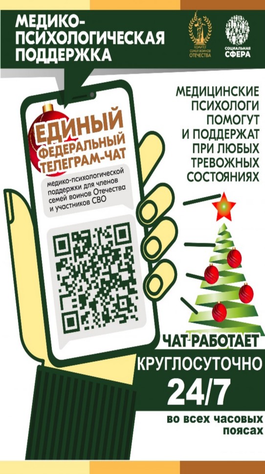 С июля 2024 года работает единый федеральный телеграм-чат медицинской психологической поддержки для семей воинов Отечества и участников СВО (далее - Чат) https://t.me/+-NlCAoiZghk2OTNi.